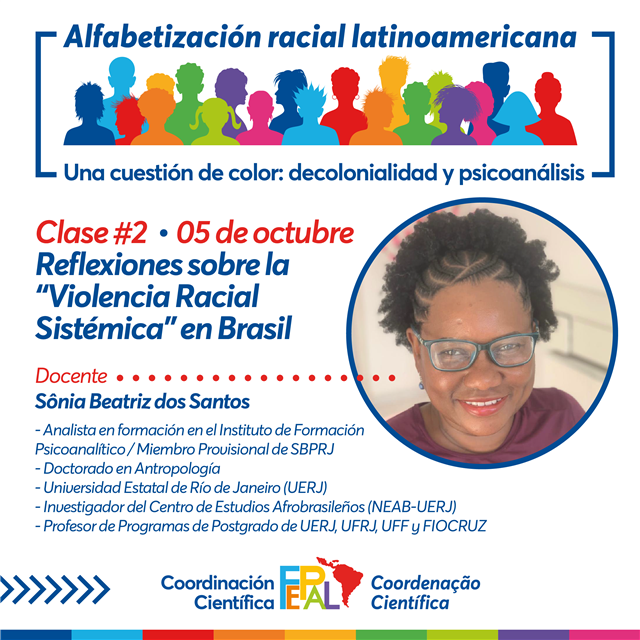 La segunda clase sobre “Reflexiones sobre la violencia racial sistemática en Brasil” se realizará el próximo jueves 5 de octubre y estará a cargo de Doctora en Antropología y Analista en formación Sonia Beatriz dos Santos.