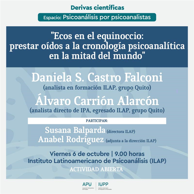 Continuando con las actividades que hemos planificado para dar a conocer al ILAP en las distintas sociedades psicoanalíticas de América Latina, los invitamos a participar de la próxima actividad en la Asociación Psicoanalítica de Uruguay (APU).