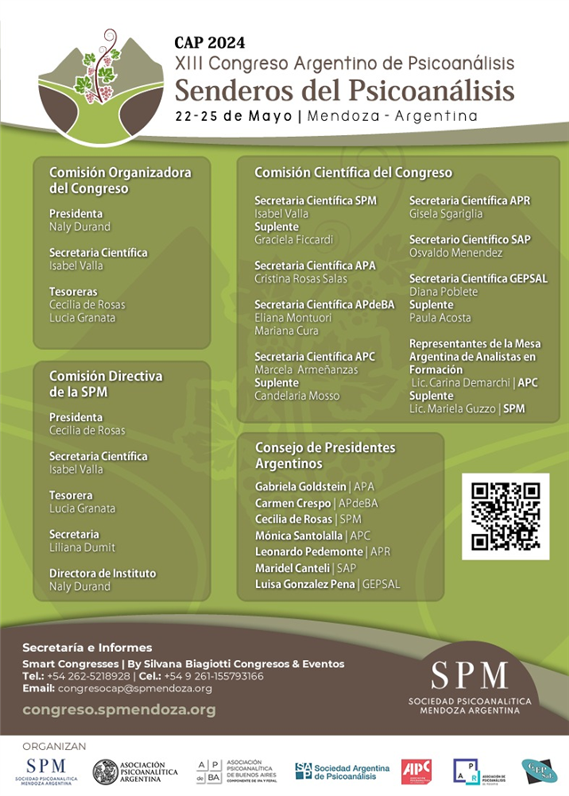 Los esperamos en Mendoza, del 22 al 25 de mayo de 2024, para recorrer juntos los “Senderos del Psicoanálisis” en nuestro XIII Congreso Argentino de Psicoanálisis. El evento será presencial y se llevará a cabo en el Centro de Congresos y Exposiciones. La Sociedad organizadora es Sociedad Psicoanalítica de Mendoza.